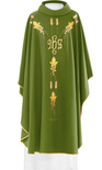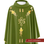 Ornat wykonany z wysokiej jakości tkaniny gładkiej, zdobiony symbolem IHS, tył ornatu zdobiony symbolem krzyża. Całość wykończona złoto-satynową lamówką. Dostępny we wszystkich kolorach liturgicznych.