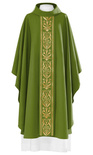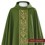 Ornat wykonany z wysokiej jakości tkaniny gładkiej, zdobiony pasem haftowanym. Całość wykończona złoto-satynową lamówką. Dostępny we wszystkich kolorach liturgicznych.