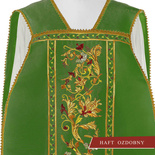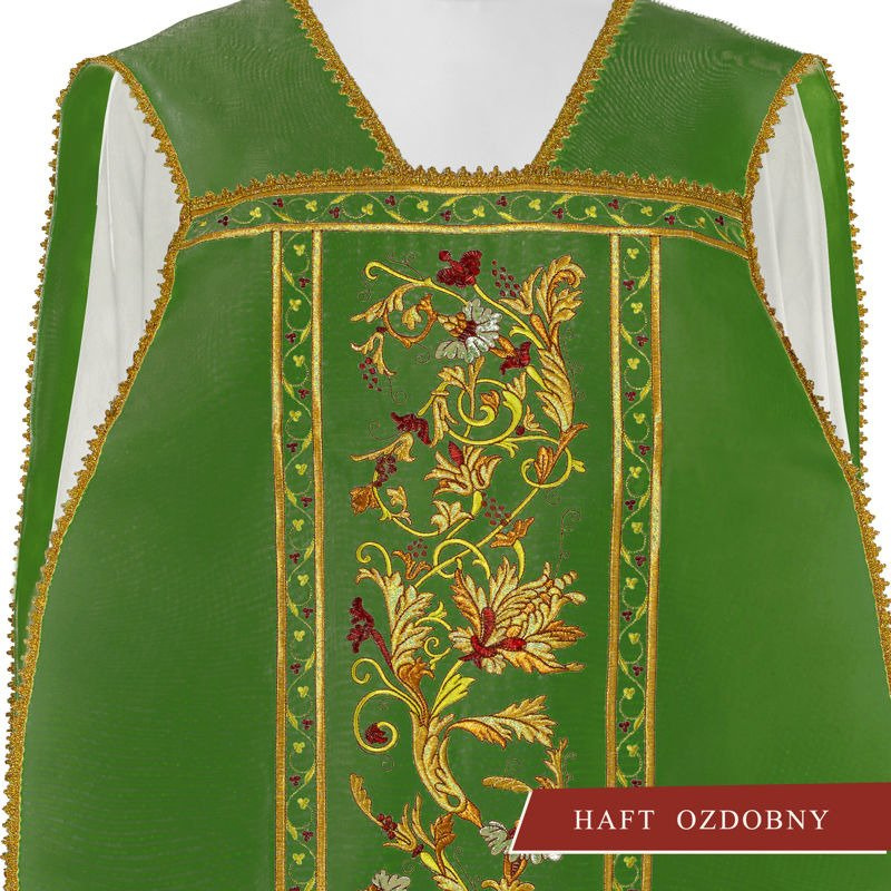 Ornat rzymski wykonany z wysokiej jakości tkaniny gładkiej, bogato zdobiony z symbolem IHS. Całość wykończona złoto-satynową lamówką. Dostępny we wszystkich kolorach liturgicznych.