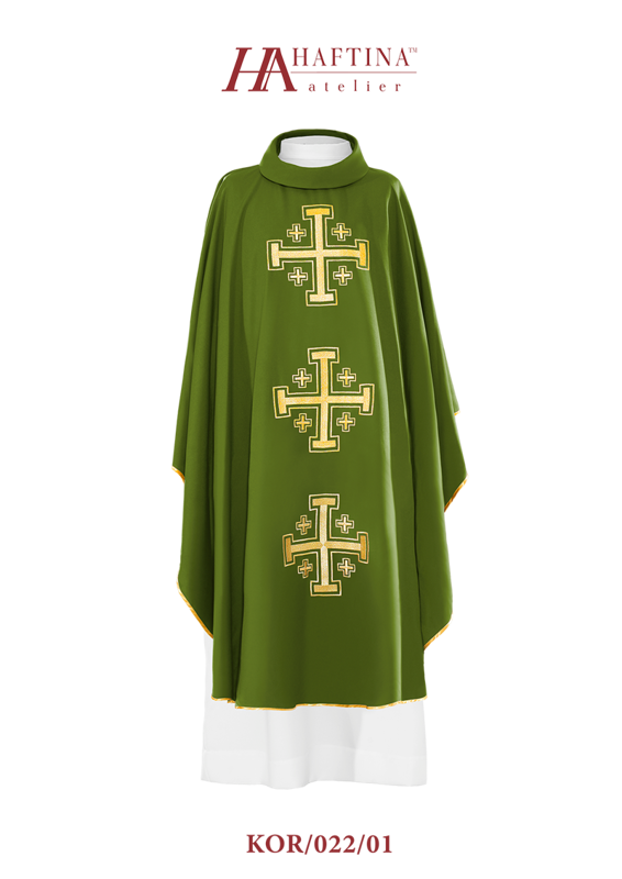 Ornat wykonany z wysokiej jakości tkaniny gładkiej, zdobiony pasem z haftowanym Krzyżem Jerozolimskim. Całość wykończona złoto-satynową lamówką. Dostępny we wszystkich kolorach liturgicznych.