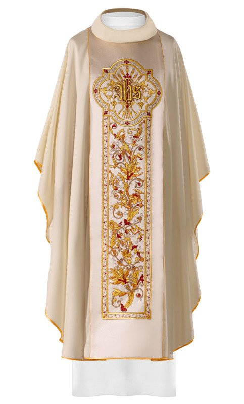 Ornat wykonany z wysokiej jakości tkaniny w kolorze zloty, zdobiony pasem z haftowanym symbolem IHS. Całość wykończona złoto-satynową lamówką.