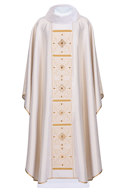 Ornat wykonany z bardzo wysokiej jakości tkaniny gładkiej błyszczącej. Szata z bogato haftowanym pasem i kołnierzem z motywem krzyża i udekorowana kamieniami. Całość wykończona przepiękną złotą taśmą. Kołnierz typu golf. Stuła wewnętrzna w komplecie.