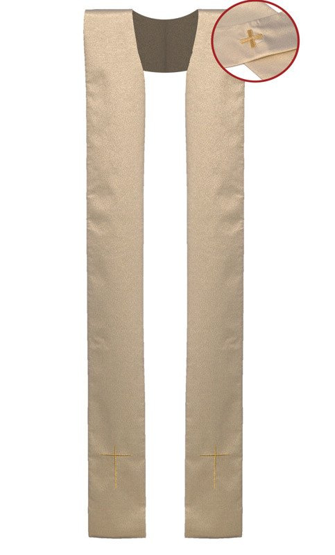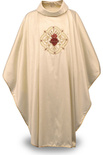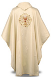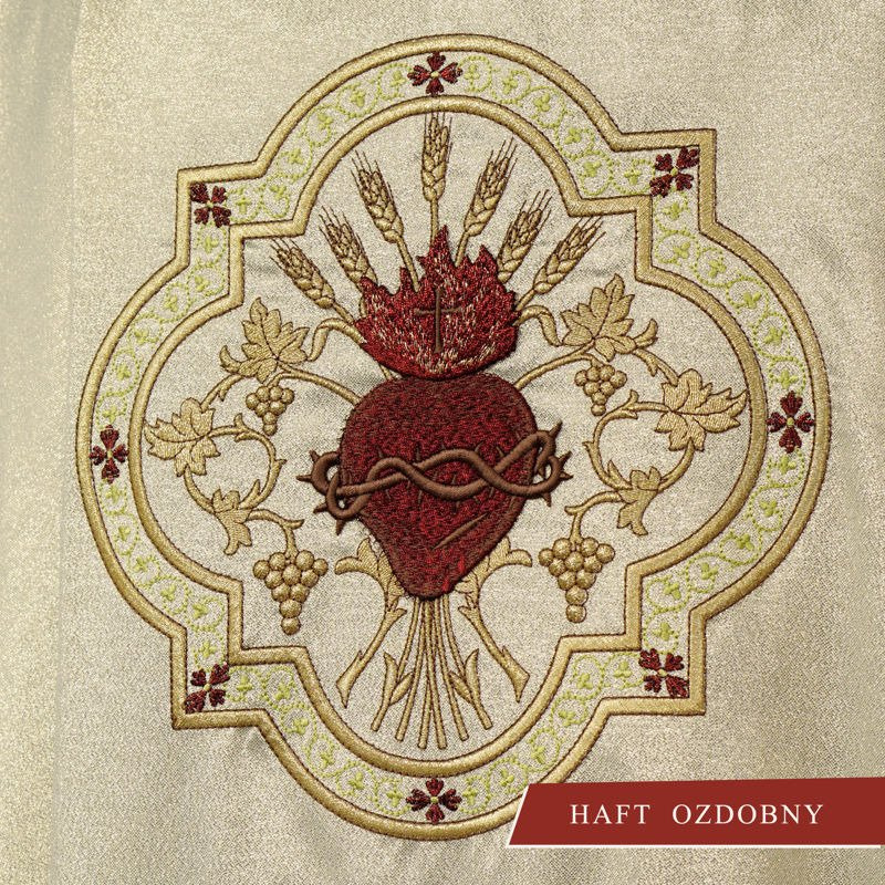 Ornat wykonany z wysokiej jakości tkaniny gładkiej. Przód ornatu zdobiony Sercem Pana Jezusa, tył szaty zdobiony symbolem kielicha eucharystycznego. Całość wykończona złoto-satynową lamówką. Dostępny w kolorze Ecru i Złotym