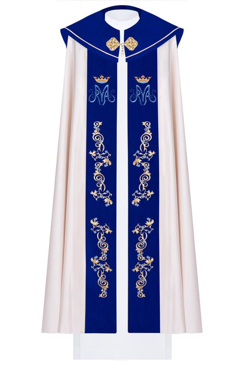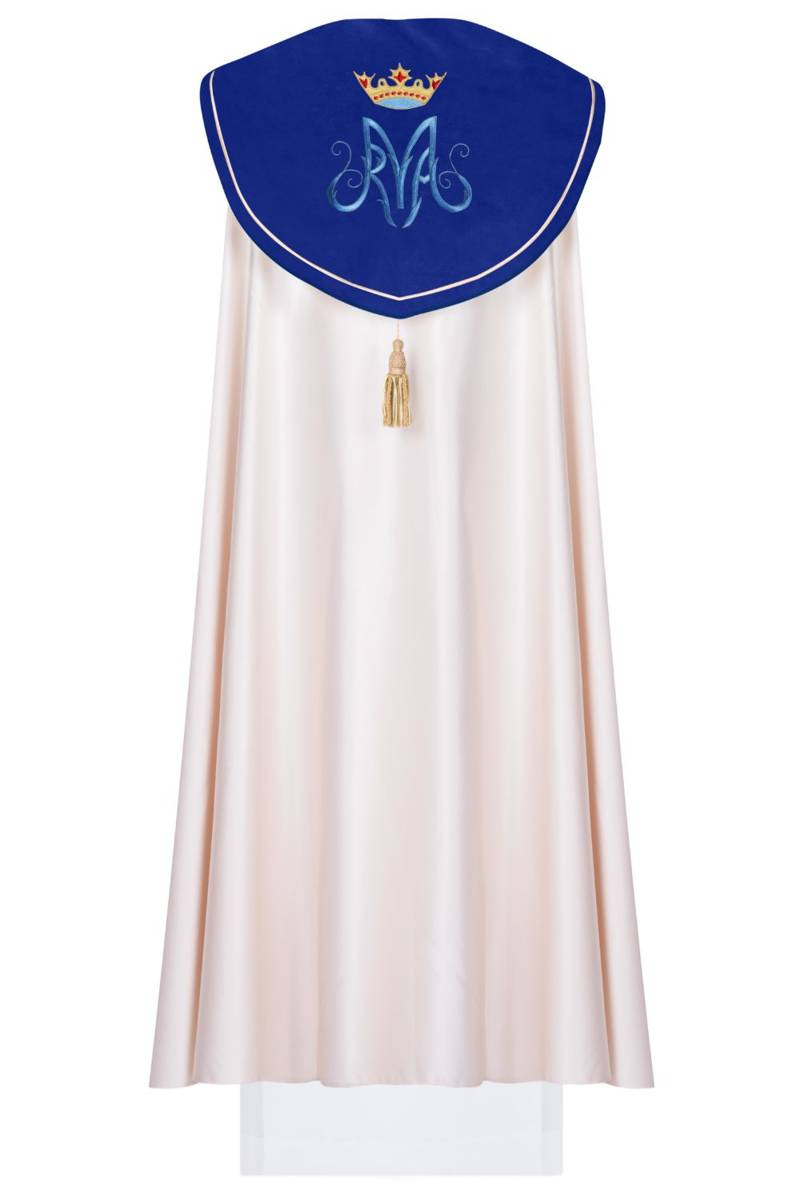Kapa wykonana z wysokiej jakości tkaniny gładkiej satynowej. Kaptur+Pasy uszyte z tkaniny 100% aksamit. Zdobiona haftem maryjnym.