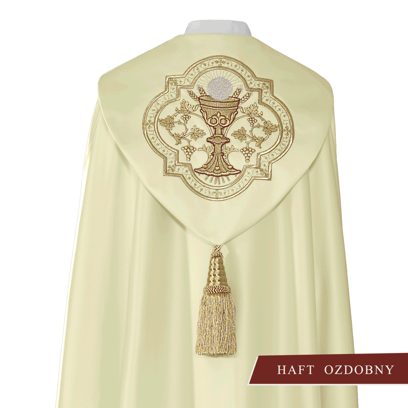 Kapa wykonana z wysokiej jakości tkaniny gładkiej satynowej. Zdobiona haftem z symbolem Kielicha