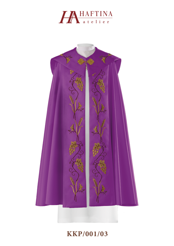 Kapa wykonana z wysokiej jakości tkaniny gładkiej satynowej. Zdobiona haftem wypukłym w kolorze złoto - bordowym. Kaptur z symbolem IHS.