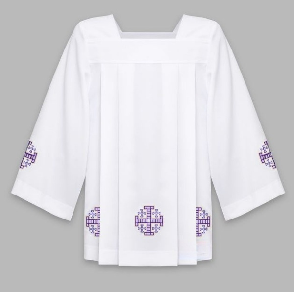 Słowa kluczowe: komża kapłańska, komża haftowana, komża z fioletowym krzyżem, komża liturgiczna, haft fioletowy krzyż, szaty kapłańskie, dewocjonalia kapłańskie, komża na adwent, komża na wielki post, komża żałobna.