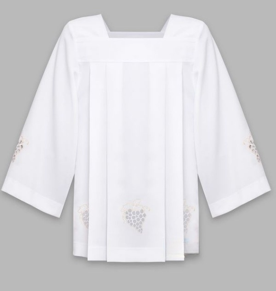 - Haft richelieu z motywem winogron – elegancki, ozdobny haft, symbolizujący Eucharystię, dodający komży uroczystego charakteru.
