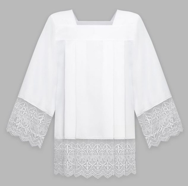 komża z żorżety, komża liturgiczna, komża z gipiurą, komża IHS, strój liturgiczny, szaty liturgiczne, komża kapłańska, komża kościelna, komża biała, komża z haftem, wyposażenie liturgiczne, szaty kapłańskie
