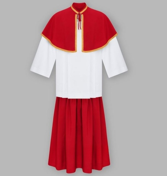 Zestaw ministrancki w kolorze czerwonym, składający się z peleryny i spódnicy, to strój liturgiczny używany podczas mszy świętych i nabożeństw, szczególnie związanych z męczeństwem i Duchem Świętym. Czerwony kolor symbolizuje krew męczenników i ogień Ducha Świętego, a zestaw zapewnia ministrantowi uroczysty i godny wygląd.
