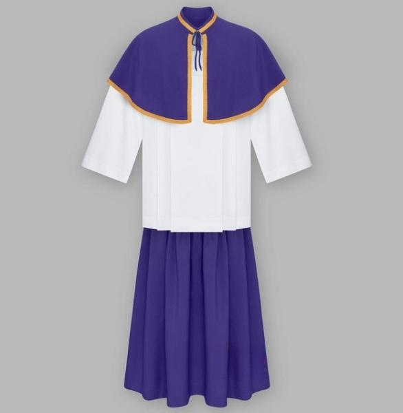 Zestaw ministrancki w kolorze fioletowym, składający się z peleryny i spódnicy, to strój liturgiczny używany podczas mszy świętych i nabożeństw, szczególnie w okresach Adwentu i Wielkiego Postu. Fioletowy kolor symbolizuje pokutę i refleksję, a zestaw zapewnia ministrantowi godny i elegancki wygląd.