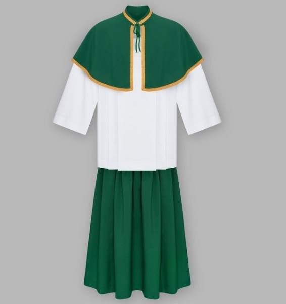 Zestaw ministrancki w kolorze zielonym, składający się z peleryny i spódnicy, to strój liturgiczny używany podczas mszy świętych i nabożeństw w okresie Zwykłym. Zielony kolor symbolizuje nadzieję i życie wieczne, a zestaw zapewnia ministrantowi godny i elegancki wygląd.