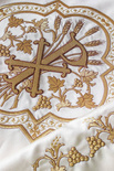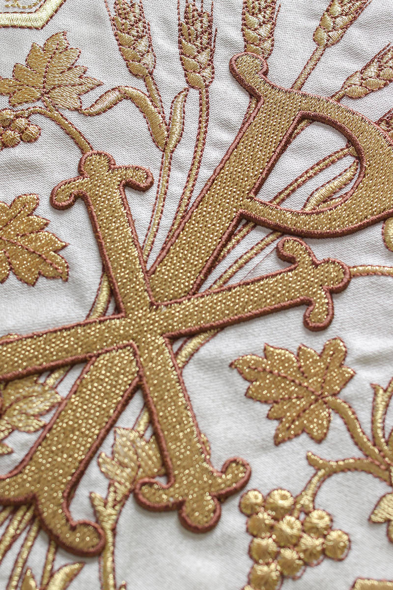 – Haft ozdobny wykonany na plechach oraz na bokach welonu. Tylni haft przedstawiający symbol liturgiczny PX.