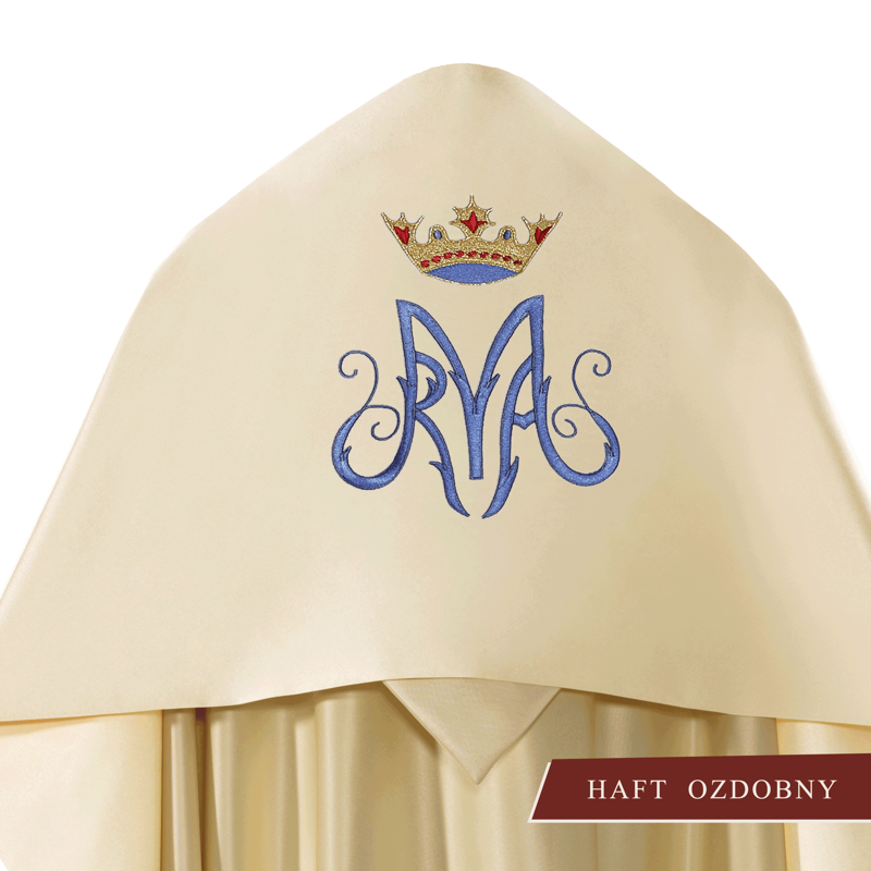 - Haft ozdobny wykonany na plechach. Tylni haft przedstawiający symbol liturgiczny Maryjny.