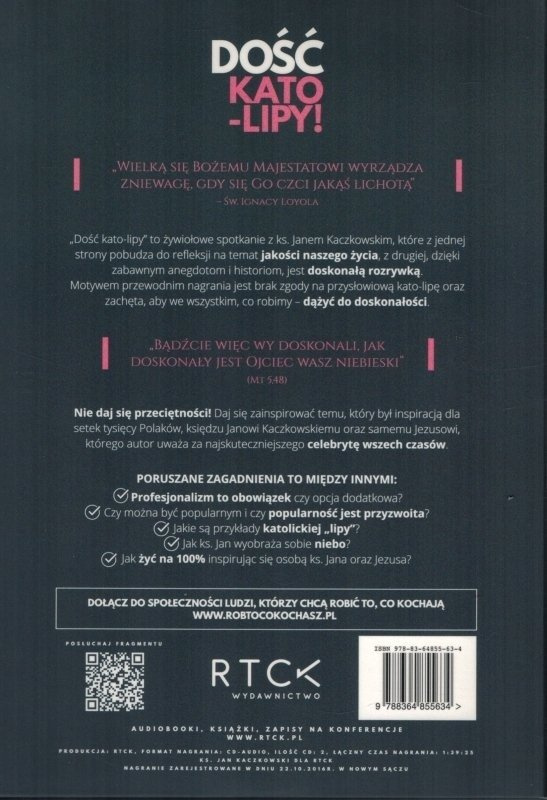 "Dość kato-lipy" to żywiołowe spotkanie z ks. Janem Kaczkowskim, które z jednej strony pobudza do refleksji na temat jakości naszego życia, z drugiej, dzięki zabawnym anegdotom i historiom, jest doskonałą rozrywką.