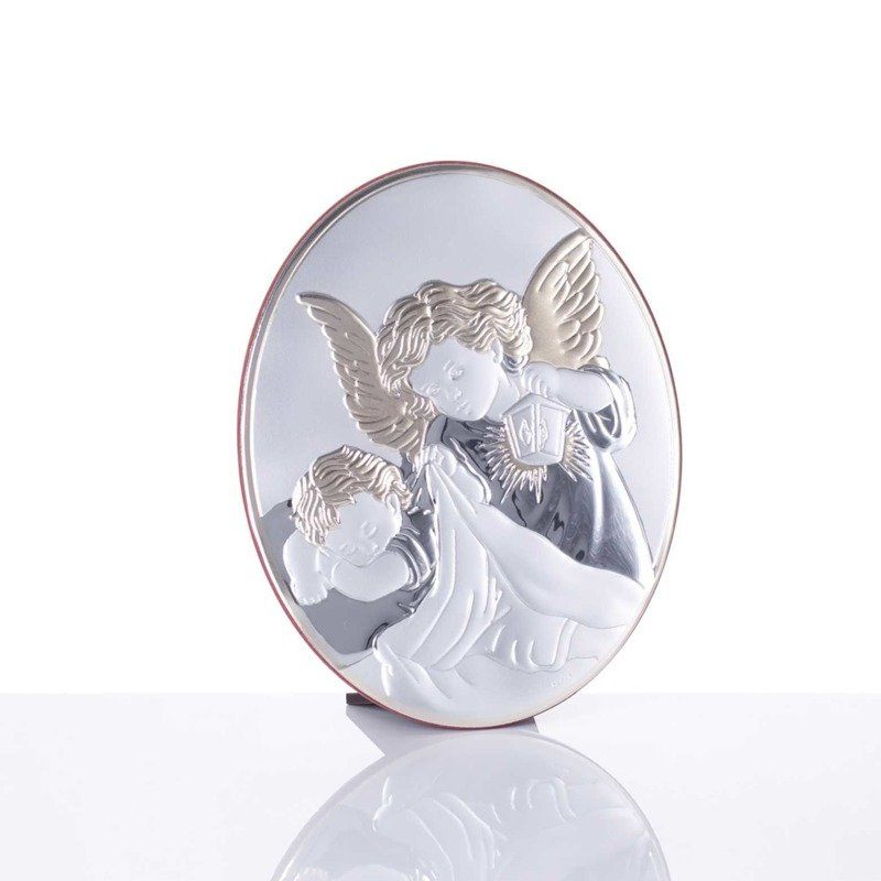 Ikona Anioł Stróż z latarenką. Przednia część aluminiowa, tył drewniany. Możliwość powieszenia lub postawienia.