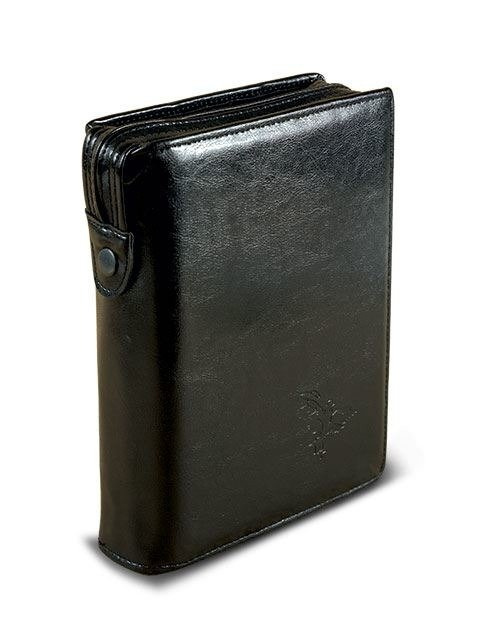 Oprawa wykonana z wysokiej jakości skóry ekologicznej, zapinana na suwak, doskonale chroni Pismo Święte przed zabrudzeniem, uszkodzeniem i wilgocią. Idealnie dopasowana do formatu dużego Pisma Świętego Starego i Nowego Testamentu, wydawanego przez Edycję Świętego Pawła. Front ozdobiony wytłoczonym znakiem gołębicy.