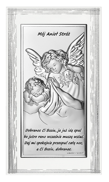 • Srebrny obrazek Aniołek z latarenką z modlitwą, prostokątny na białym zdobionym drewnie