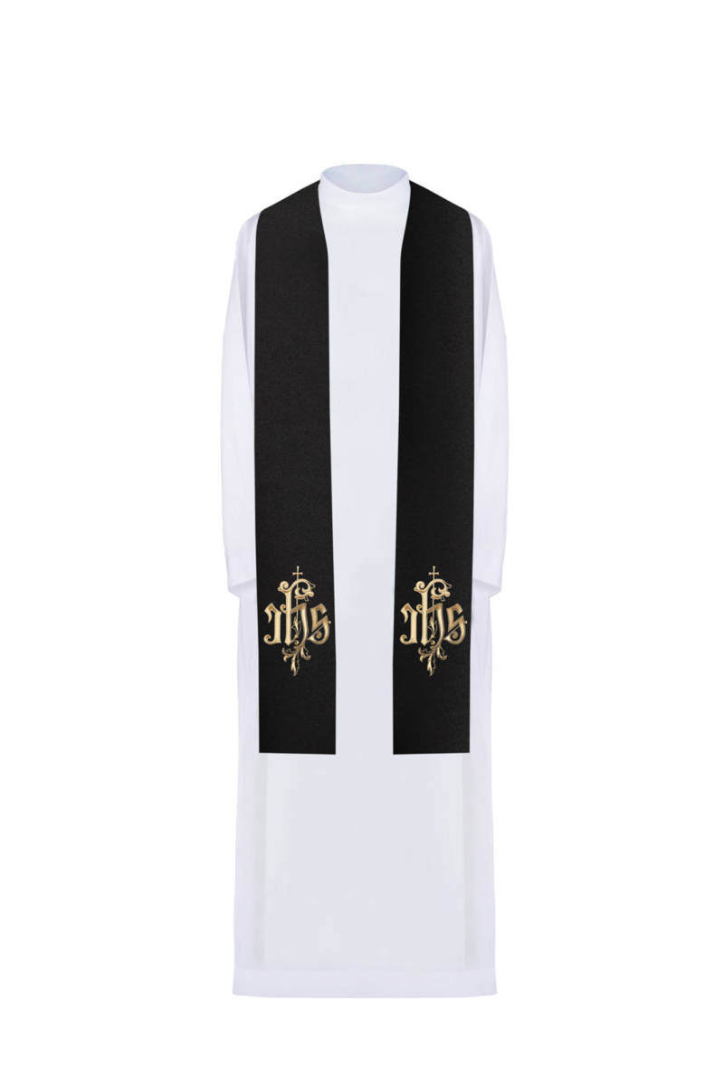 Stuła jednostronna wykonana z wysokiej jakości tkaniny gładkiej, zdobiona bogatym haftem z symbolem IHS.