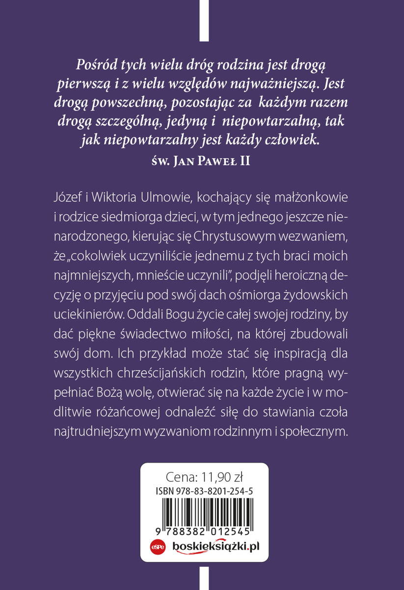 Józef i Wiktoria Ulmowie, kochający się małżonkowie i rodzice siedmiorga dzieci, w tym jednego jeszcze nienarodzonego, kierując się Chrystusowym wezwaniem, że „cokolwiek uczyniliście jednemu z tych braci moich najmniejszych, mnieście uczynili”, podjęli heroiczną decyzję o przyjęciu pod swój dach ośmiorga żydowskich uciekinierów. Oddali Bogu życie całej swojej rodziny, by dać piękne świadectwo miłości, na której zbudowali swój dom. Ich przykład może stać się inspiracją dla wszystkich chrześcijańskich rodzin, które pragną wypełniać Bożą wolę, otwierać się na każde życie i w modlitwie różańcowej odnaleźć siłę do stawiania czoła najtrudniejszym wyzwaniom rodzinnym i społecznym.