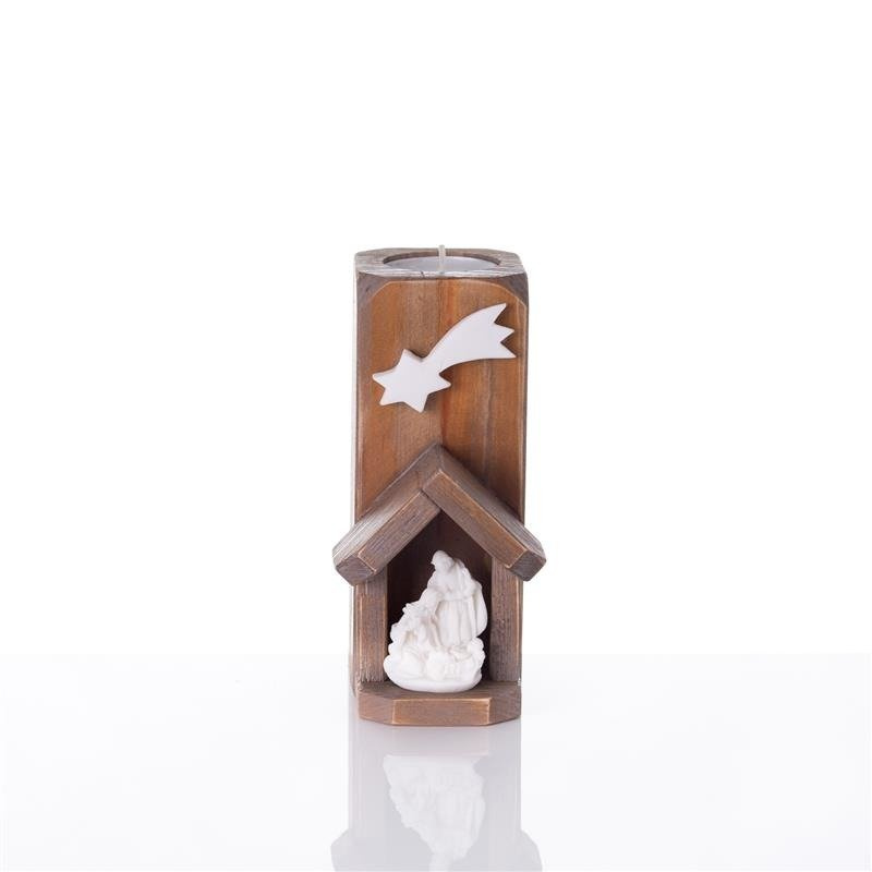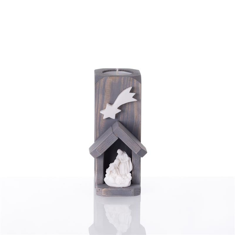 Bardzo elegancki świecznik bożonarodzeniowy ze Świętą Rodziną. Wymiary 14,5 x 6 x 10 cm. Idealnie pasujący do wystroju każdego mieszkania.