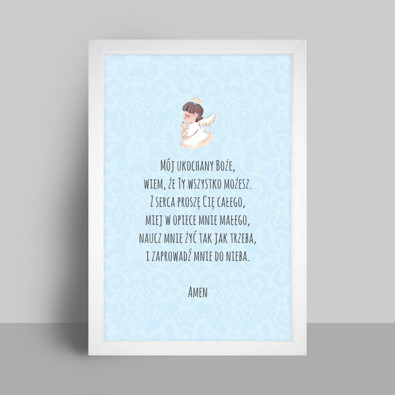 • Obraz dla dzieci w białej ramce z modlitwą.