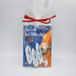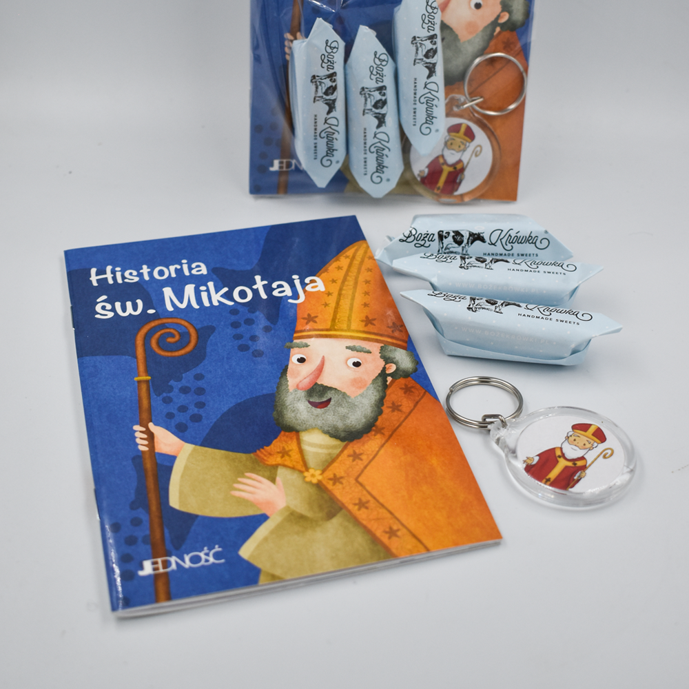 Mikołajki to idealny czas na wręczanie drobnych prezentów. Proponujemy katolicki prezent na Mikołajki dla dzieci. W zestawie znajduje się książka "Historia Świętego Mikołaja", breloczek do kluczy z wizerunkiem św. Mikołaja oraz trzy, słodkie Boże Krówki. Cały zestaw został ładnie zapakowany i ozdobiony czerwoną wstążką.