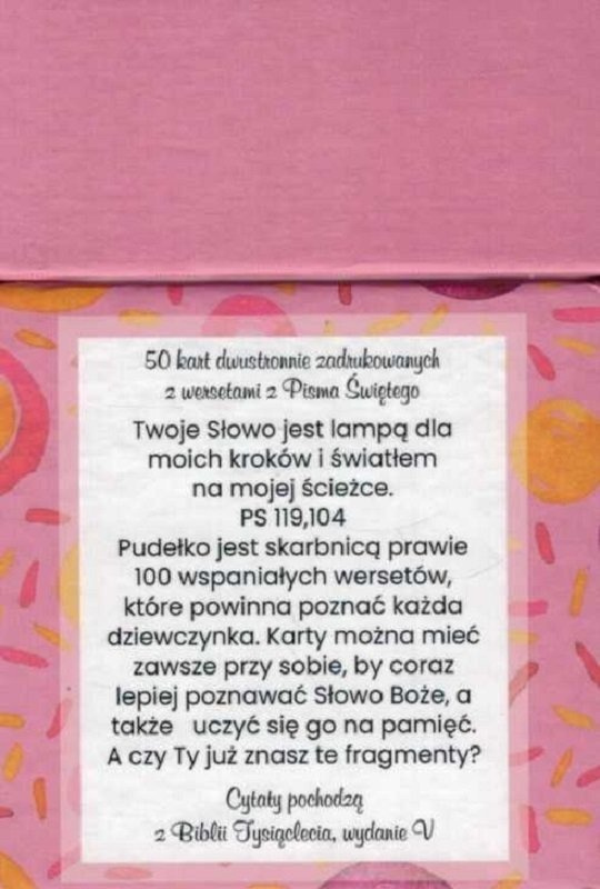 Pudełko jest skarbnicą prawie 100 wspaniałych wersetów, które powinna poznać każda dziewczynka. Karty można mieć zawsze przy sobie, by coraz lepiej poznawać Słowo Boże, a także uczyć się go na pamięć. A czy Ty już znasz te fragmenty?
