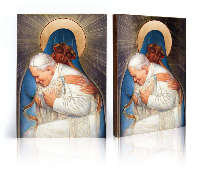 Wizerunek znajdujący się na ikonie jest pewnego rodzaju odwzorowaniem miłości Świętego Jana Pawła II do Matki Bożej Częstochowskiej. To właśnie Najświętsza Maryja Panna wskazywała mu drogę przez cały Wielki Pontyfikat; w sposób szczególny pragnął powierzyć Kościół właśnie Matce Bożej, która pokonała grzech i zło, miłowała i darzyła łaską każdego nawet największego grzesznika. Jan Paweł II uważał siebie za jej sługę, a swoje życie poświęcił jej uwielbieniu, oddaniu i zawierzeniu w jej opiekę i pewności, że to Maryja przybliży Nas do Jezusa Chrystusa. Ikona religijna dostępna w naszej ofercie w sposób szczególny podkreśla miłość Świętego Jana Pawła II do Najświętszej Maryi Panny.