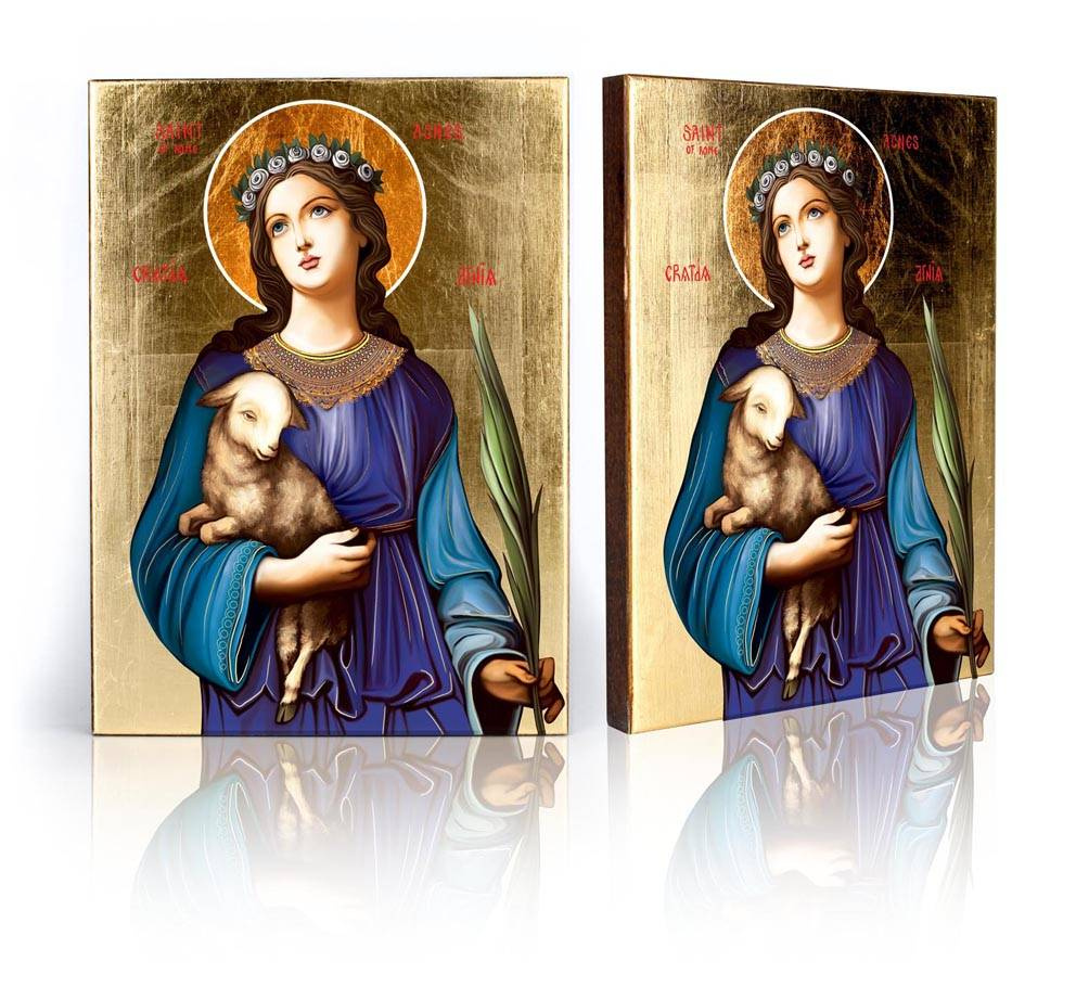 Ikona religijna przedstawia wizerunek Świętej Agnieszki. Wszystkie ikony dostępne w naszej ofercie wykonane są z najwyższej jakości materiałów. Drewno wykorzystywane do produkcji ikon dobierane jest w niezwykle staranny sposób. Wizerunek naniesiony na ręcznie złoconą deskę. Produkt wspaniale sprawdzi się jako jedyny w swoim rodzaju upominek dla najbliższych.