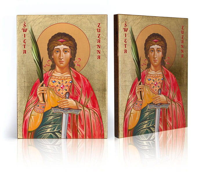 Ikona religijna przedstawia wizerunek Świętej Zuzanny. Wszystkie ikony dostępne w naszej ofercie wykonane są z najwyższej jakości materiałów. Drewno wykorzystywane do produkcji ikon dobierane jest w niezwykle staranny sposób. Wizerunek naniesiony na ręcznie złoconą deskę. Produkt wspaniale sprawdzi się jako jedyny w swoim rodzaju upominek dla najbliższych.