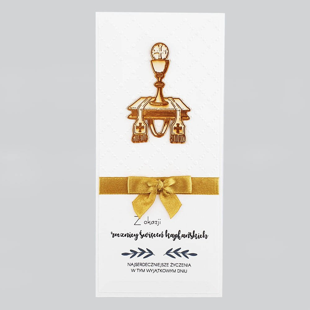 Ręcznie wykonana kartka dla Kapłana z okazji rocznicy święceń z elementem z drewna.