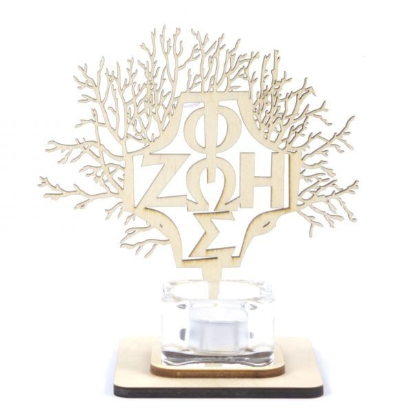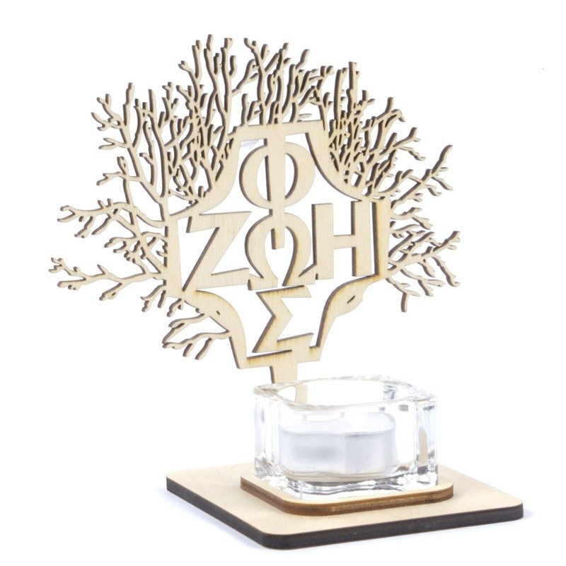 Świecznik ze znakiem Fos-Zoe wpisanym w drzewo, z podstawką na świeczkę typu tealight.