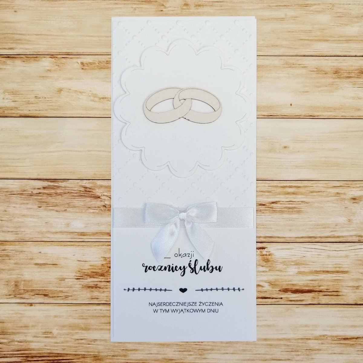 Ręcznie wykonana kartka na rocznicę ślubu z obrączkami z drewna.
