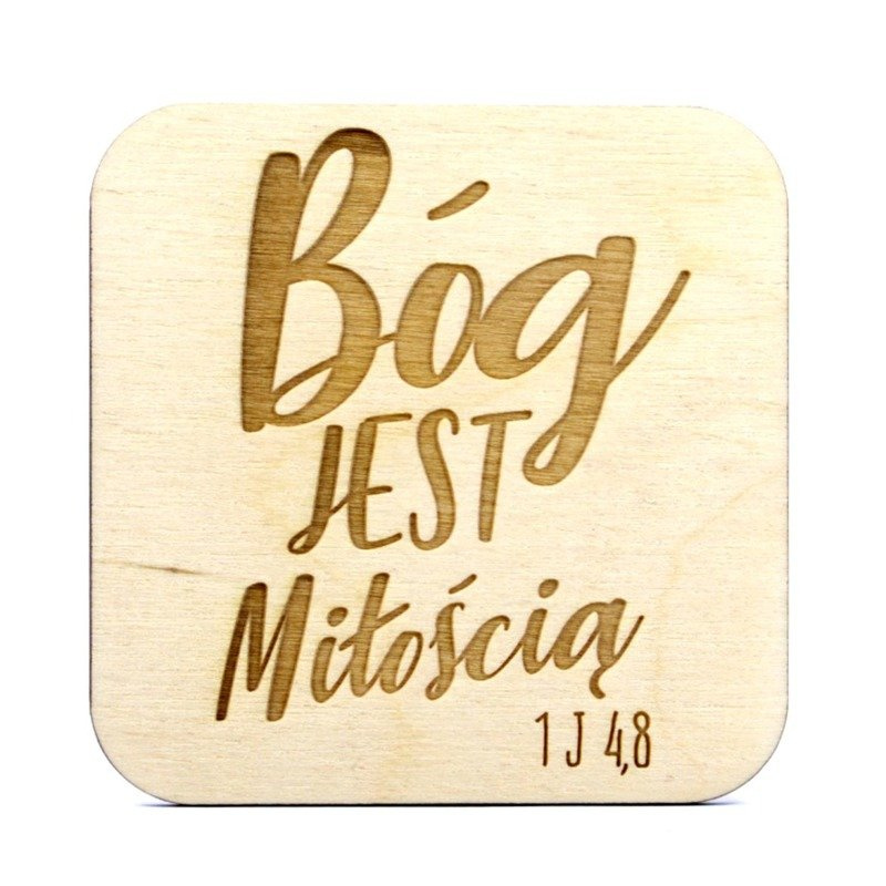 Podstawka pod kubek z cytatem z Pisma Świętego: „Bóg jest Miłością” 1 J 4,8.