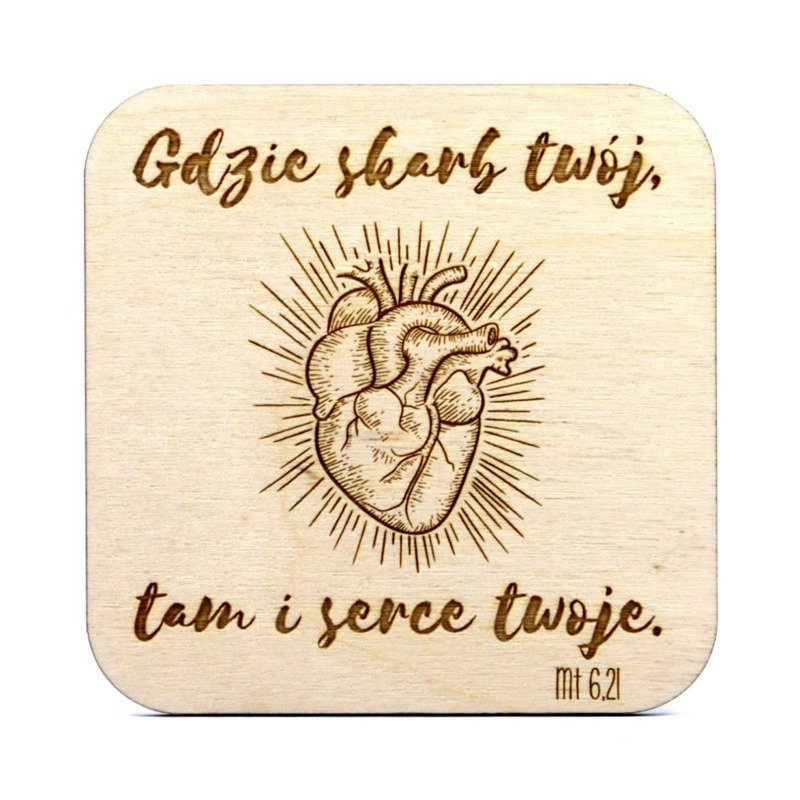 Podstawka pod kubek z cytatem z Pisma Świętego: „Gdzie skarb twój, tam i serce twoje” Mt 6,21.