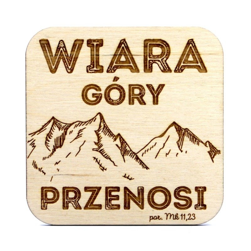 Podstawka pod kubek z cytatem z Pisma Świętego: „Wiara góry przenosi” Mk 11,23.