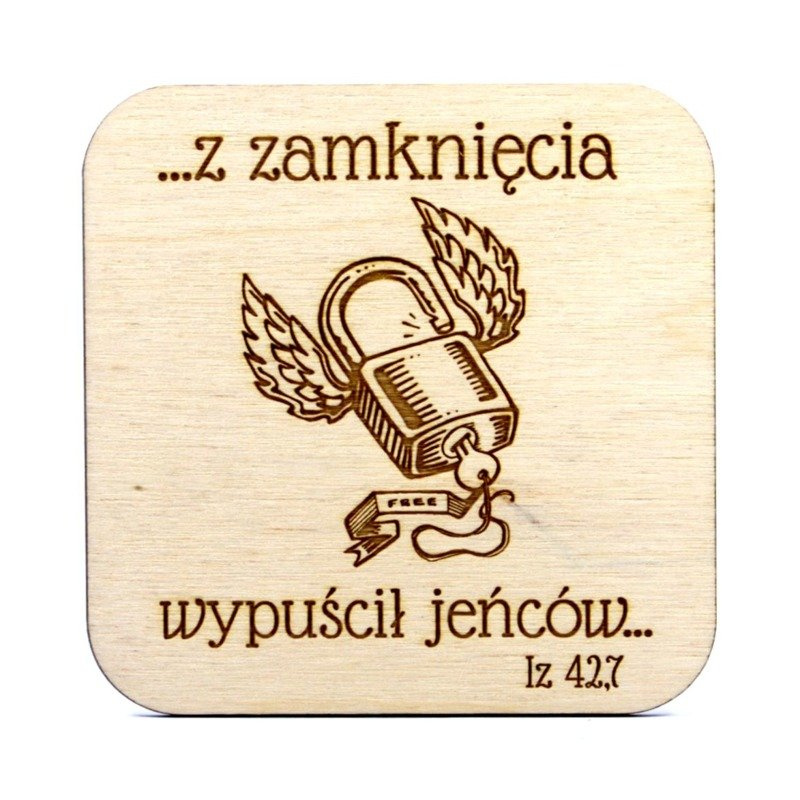 Podstawka pod kubek z cytatem z Pisma Świętego: „Z zamknięcia wypuścił jeńców” Iz 42, 7.