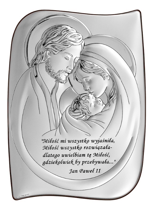 • Srebrny obrazek z wizerunkiem Św. Rodziny z cytatem, o nieregularnym kształcie