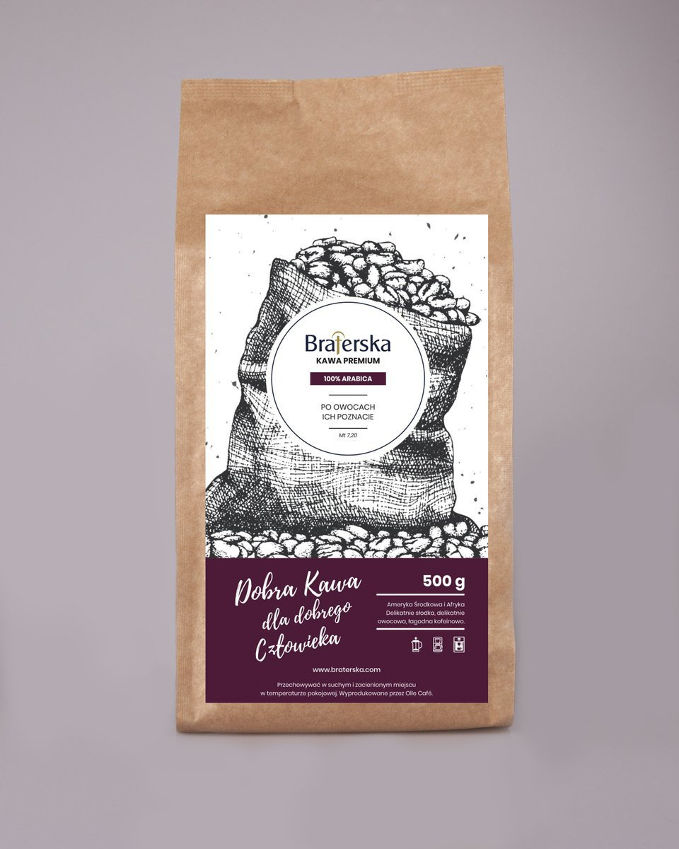 Kawa Braterska Premium to 100% arabiki, kawa ziarnista średnio palona o delikatnym owocowym aromacie. Idealnie nadaje się do parzenia w ekspresach automatycznych i kolbowych. Po wcześniejszym zmieleniu nada się również idealnie do tradycyjnego palenia lub w ekspresie przelewowym.