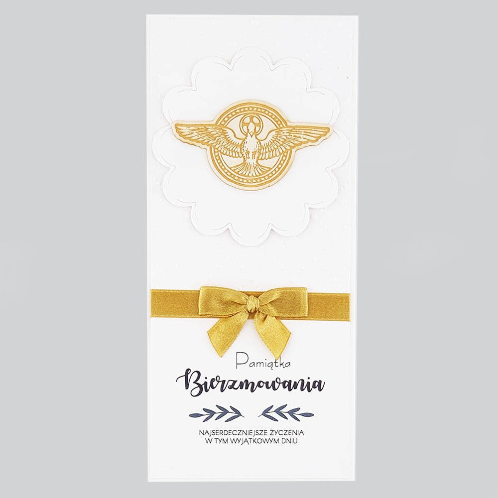 Ręcznie wykonana kartka na bierzmowanie z drewnianą gołębicą.