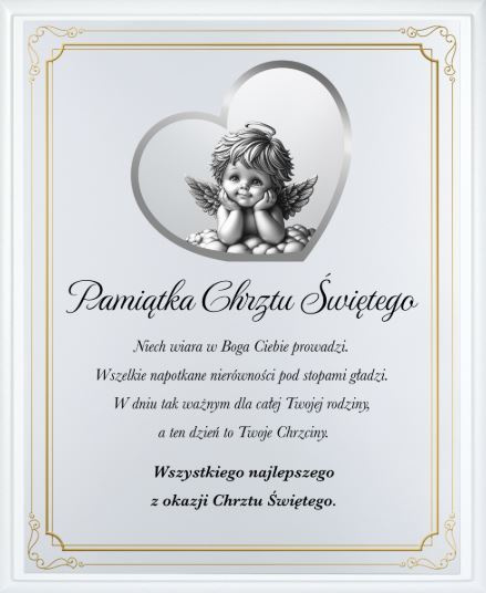 Tekst brzmi: "Pamiątka Chrztu Świętego. Niech wiara w Boga Ciebie prowadzi. Wszelkie napotkane nierówności pod stopami gładzi. W dniu tak ważnym dla całej Twojej rodziny, a ten dzień to Twoje Chrzciny. Wszystkiego najlepszego z okazji Chrztu Świętego."