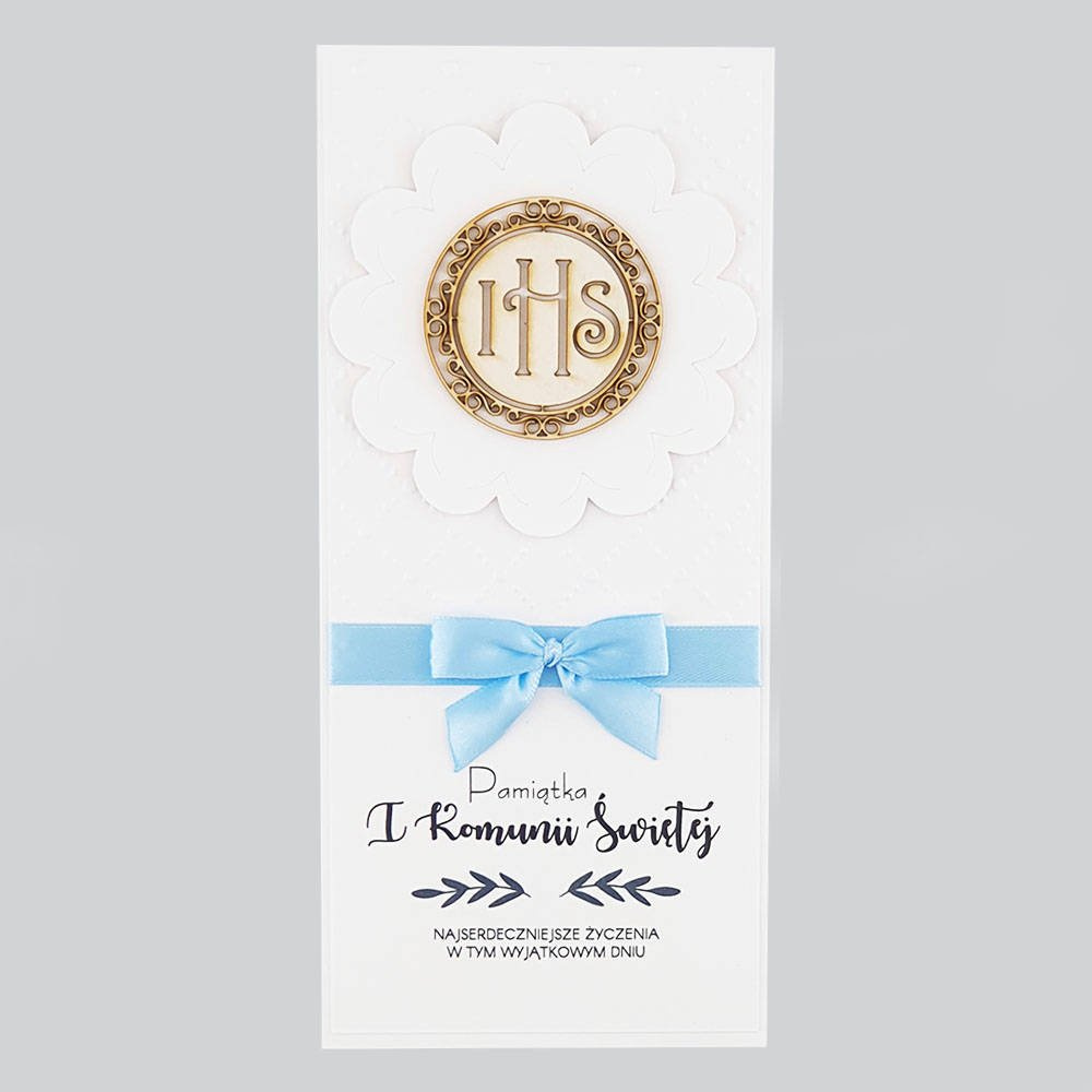 Ręcznie wykonana kartka na Pierwszą Komunię Świętą z tekturową hostią.