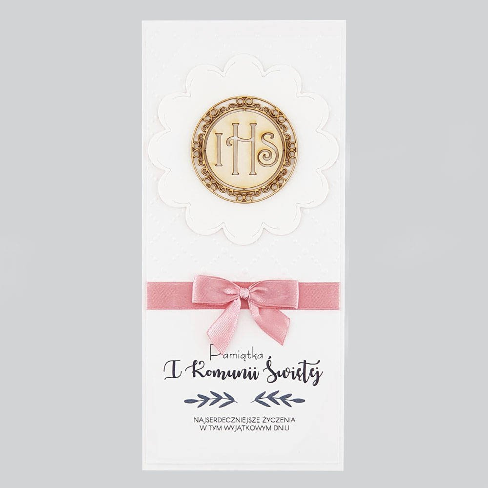 Ręcznie wykonana kartka na Pierwszą Komunię Świętą z tekturową hostią.