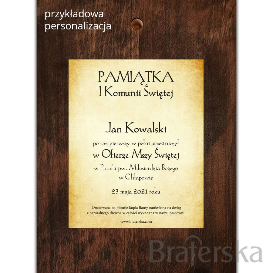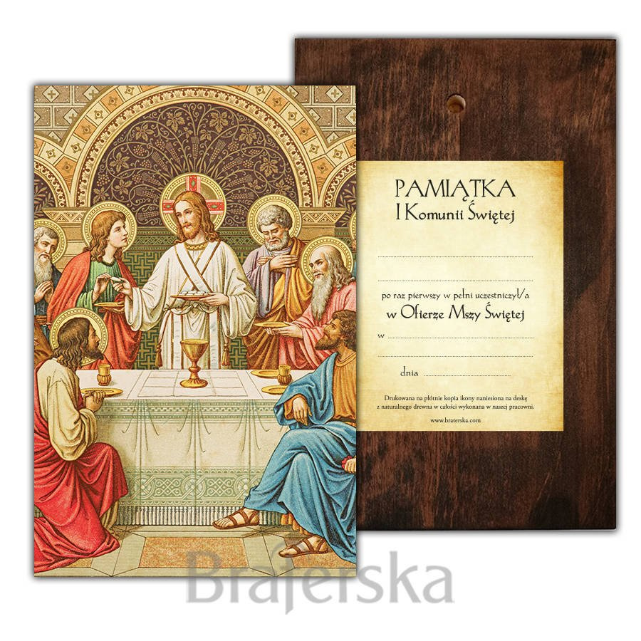 - Ikona drukowana na płótnie Eucharystia to doskonały pomysł na Pamiątkę I Komunii Świętej. Wydruk nałożono na wysokiej jakości drewno naturalne.