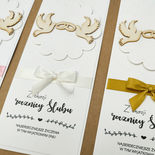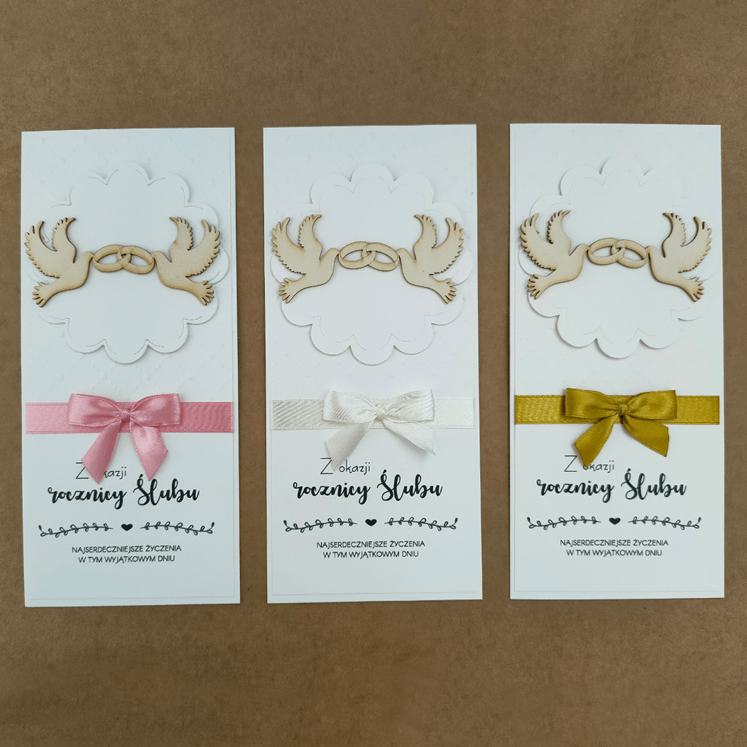 Kolor wstążek to złoty, biały lub różowy. Jeśli nie zostanie wskazany kolor wstążki przy zamówieniu, wtedy kartkę wysyłamy z losowo wybranym kolorem wstążki.