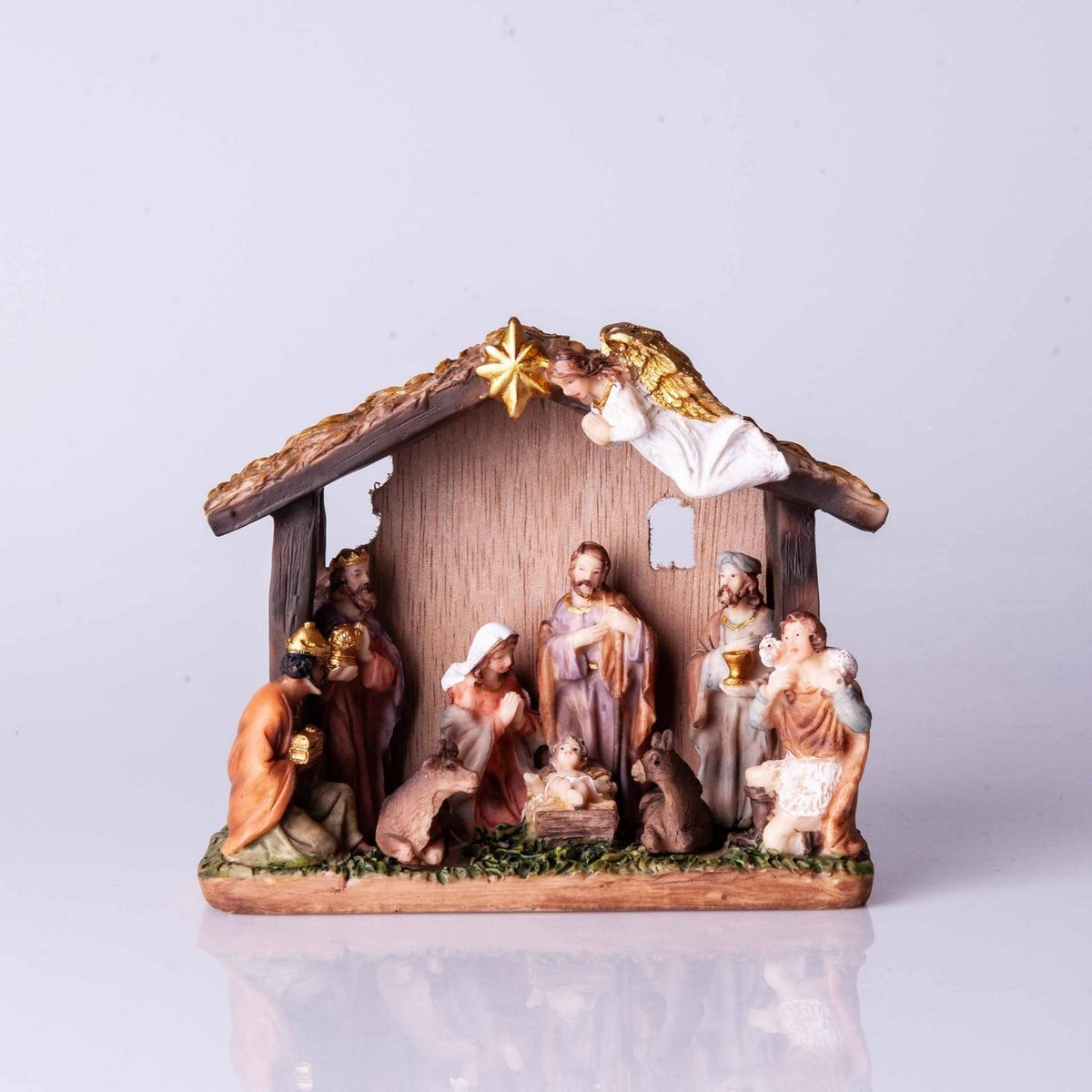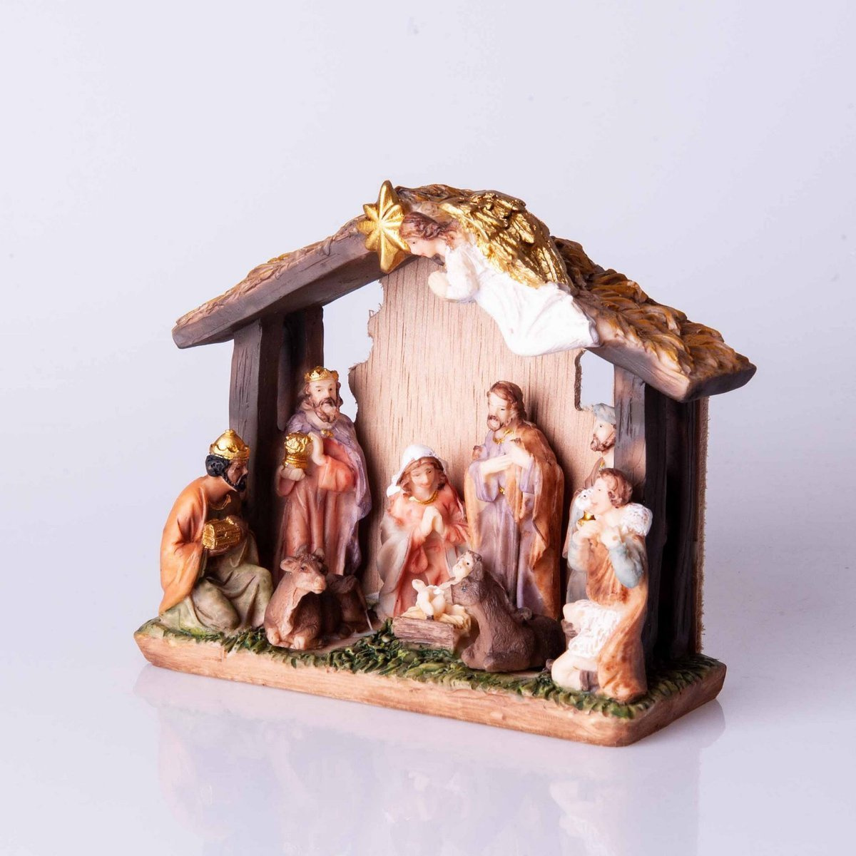 Szopka bożonarodzeniowa idealna na prezent dla ludzi ceniących piękno świąt Bożego Narodzenia. W szopce znajdziemy Józefa, Maryję, dzieciątko, Kacpra, Melchiora i Baltazara oraz pasterza ze zwierzętami. Starannie odwzorowanie szczegółów, pozwala przybyłym gościom zachwycać się pięknem Szopki Bożonarodzeniowej. Wysokość 10,5 cm. Długość 12 cm. Szerokość 4,5 cm.