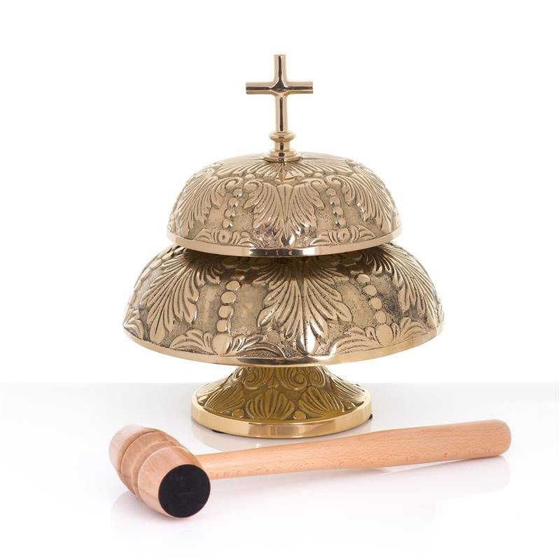 Gong podwójny, dwutonowy, zdobiony. Zabezpieczony lakierem bezbarwnym. Młotek drewniany w komplecie.