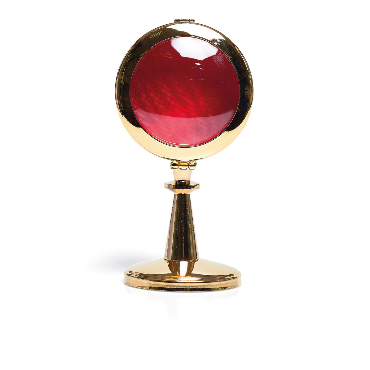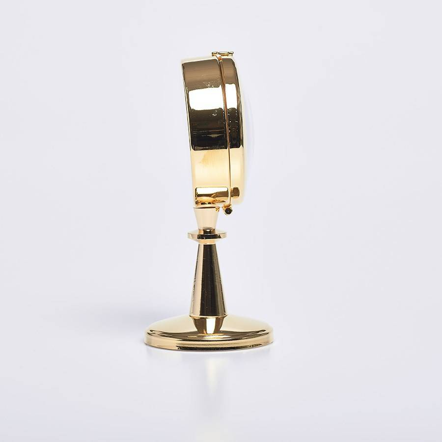 Podkreśl cześć i godność relikwii w Twojej świątyni dzięki naszemu eleganckiemu relikwiarzowi z podstawą, wykonanemu ze złoconego mosiądzu, z wnętrzem wyściełanym czerwonym welurem i szklanym iluminatorem. Ten wyjątkowy relikwiarz o wysokości 16 cm to idealne naczynie do przechowywania i ekspozycji relikwii, łączące w sobie tradycję, bezpieczeństwo i estetykę.