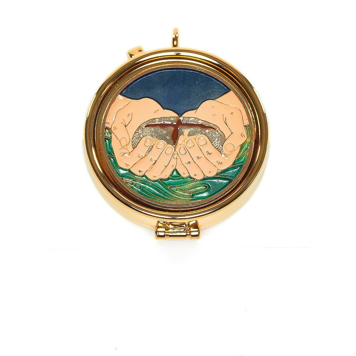 Wieczko ozdobione plakietką z kolorową emalią.